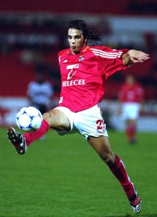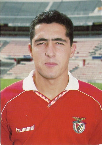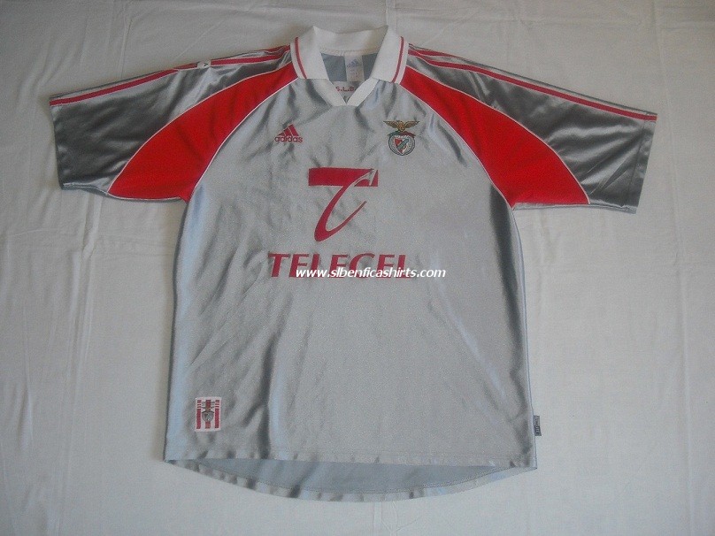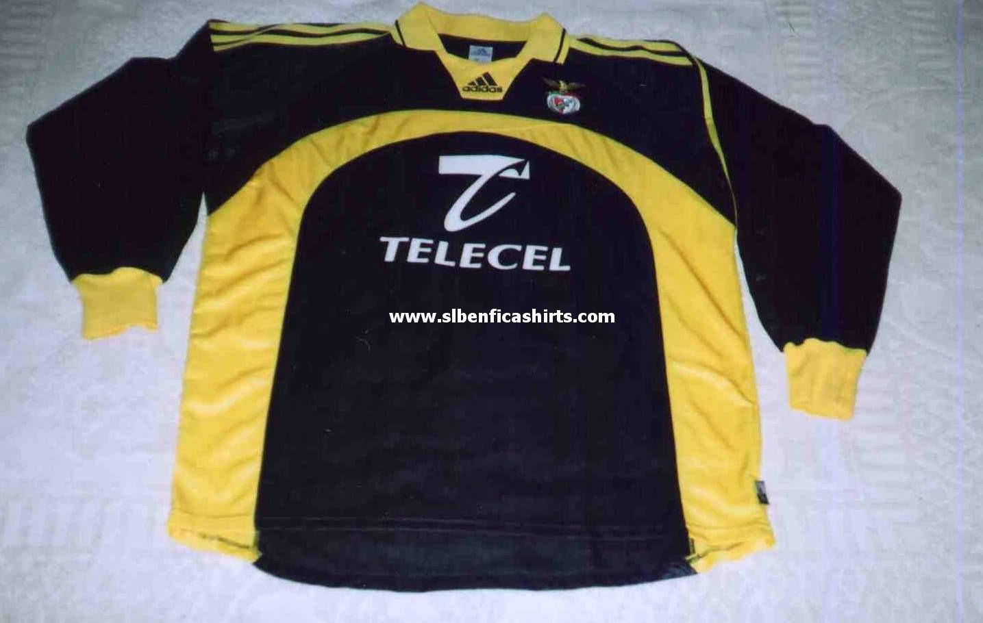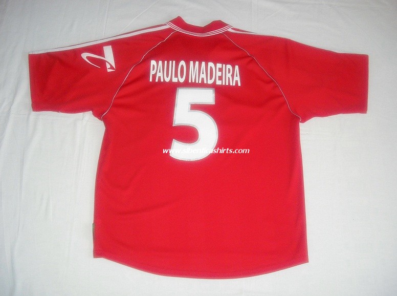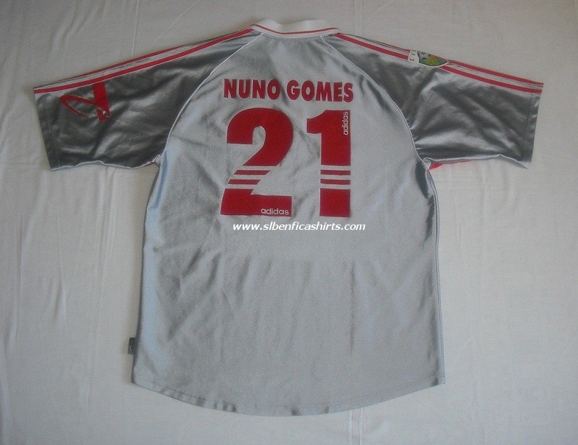 Apresento quatro Camisolas: uma cinzenta usada pelo Nuno Gomes, uma vermelha usada pelo P.Madeira (Para mais informações consulte a época 91/92 ), uma vermelha usada nas competições europeias e uma camisola de guarda – redes. Nuno Miguel Soares Pereira Ribeiro nasceu a 05-07-1976, natural de Amarante. Ingressou no SLB na época de 1997/98, totalizando 12 épocas de Águia ao peito, ocupa a posição de Avançado. Foi Internacional Português com 79 internacionalizações. Todas as blusas são da marca Adidas e com o patrocínio da Telecel. |